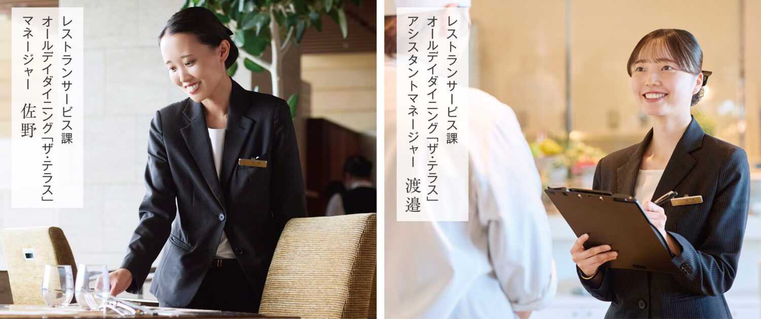 渡邉:私はお料理の提供、お客様のご案内、ブッフェ台のメニューのデザイン作成が主な仕事です。後輩が素敵なホテリエに成長できるよう、育成にも注力しています。