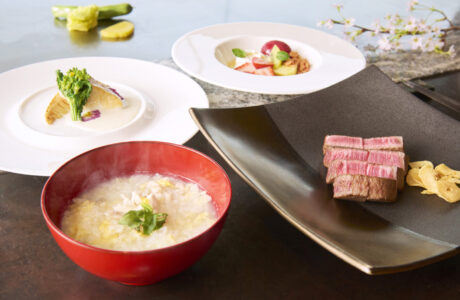 黒毛和牛の鉄板焼と河豚雑炊を主役に据えた、初春限定のランチコース。河豚は地域によって「ふく」とも呼ばれ、福に通じる縁起の良い食材として親しまれてきました。新たな季節の始まりに、皆様へ福が訪れることを願い、滋味深い河豚雑炊としてお届けいたします。目の前で仕上げる鉄板焼の臨場感とともに、穏やかな昼のひとときをご堪能ください。
