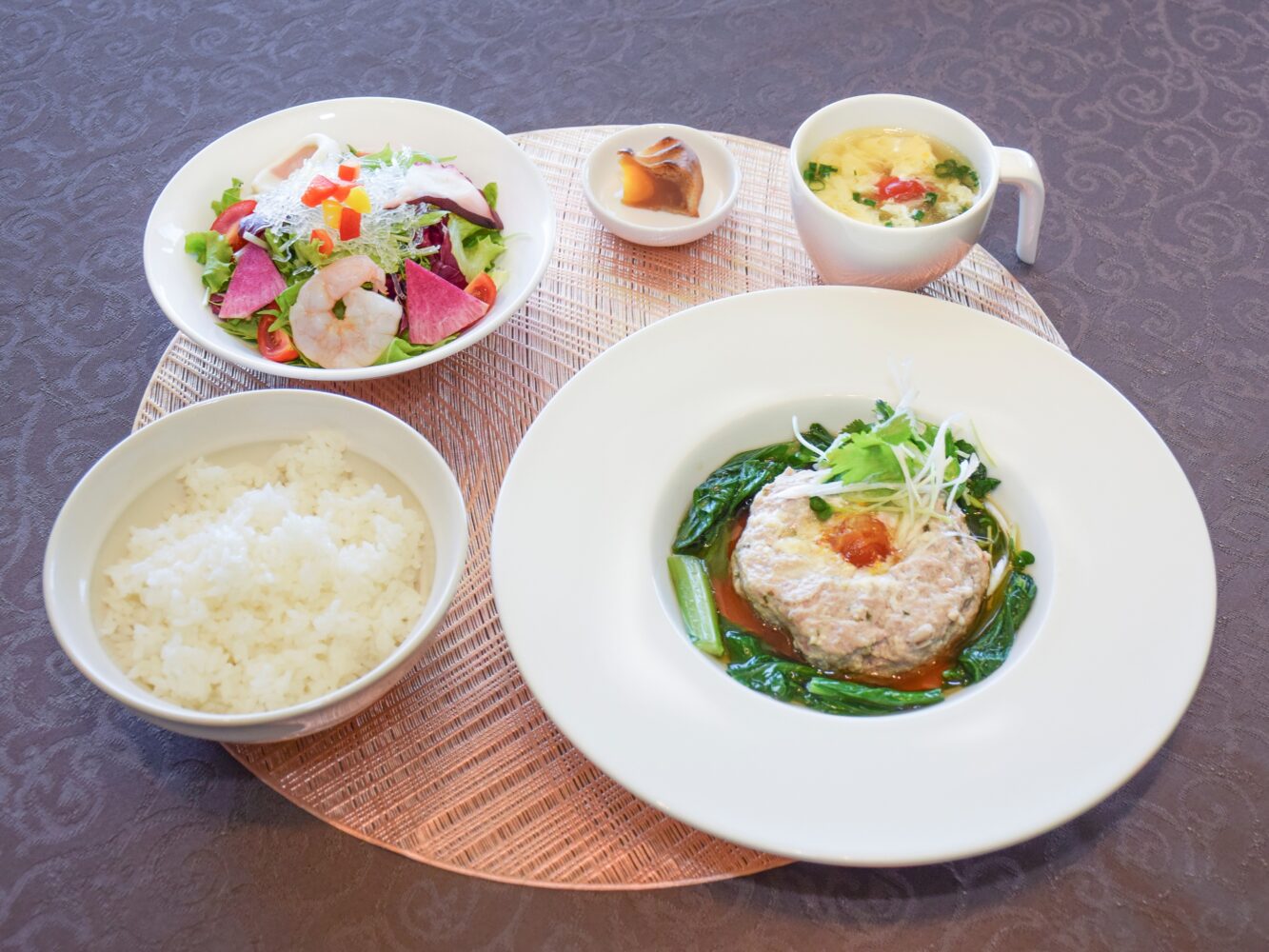 塩漬け卵の黄身をのせた中華風ハンバーグ、彩り海鮮サラダ、本日のスープ、ご飯、月餅