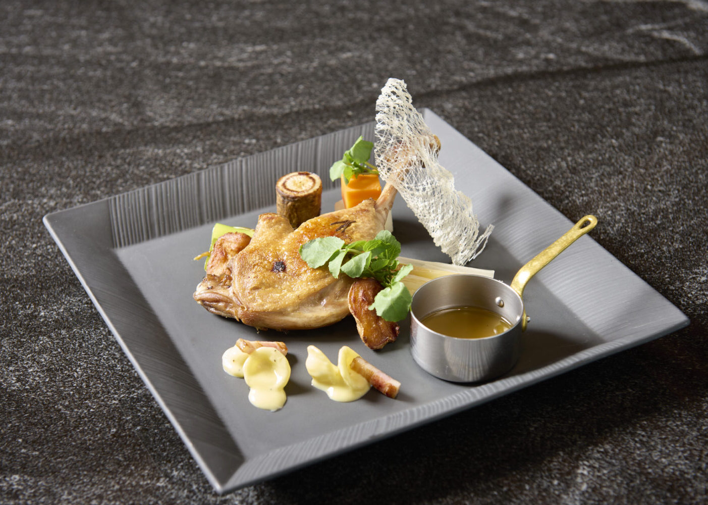 旨みを閉じ込めた骨付き鴨肉をオイルで丁寧に煮込み、皮目を香ばしく焼き上げ、甘みや食感に富んだ冬野菜を添えました。チーズの香り豊かなカルボナーラソースと爽やかな酸味のグリーンマスタードを合わせながら、季節の恵みが織りなす味わいの調和をご堪能ください。