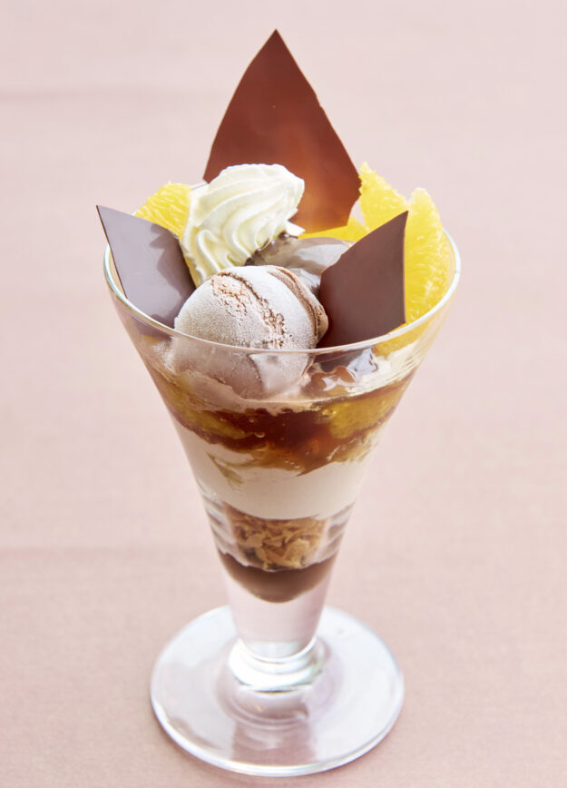 ミルクチョコレートのパンナコッタに、芳醇なアールグレイジュレとジューシーなオレンジの爽やかさをプラス。チョコレートソースとフィアンティーヌのサクサク感、アイスクリームの冷たさが絶妙に調和。特別なひとときを彩る、贅沢な味わいのオレンジショコラパフェをお楽しみください。
