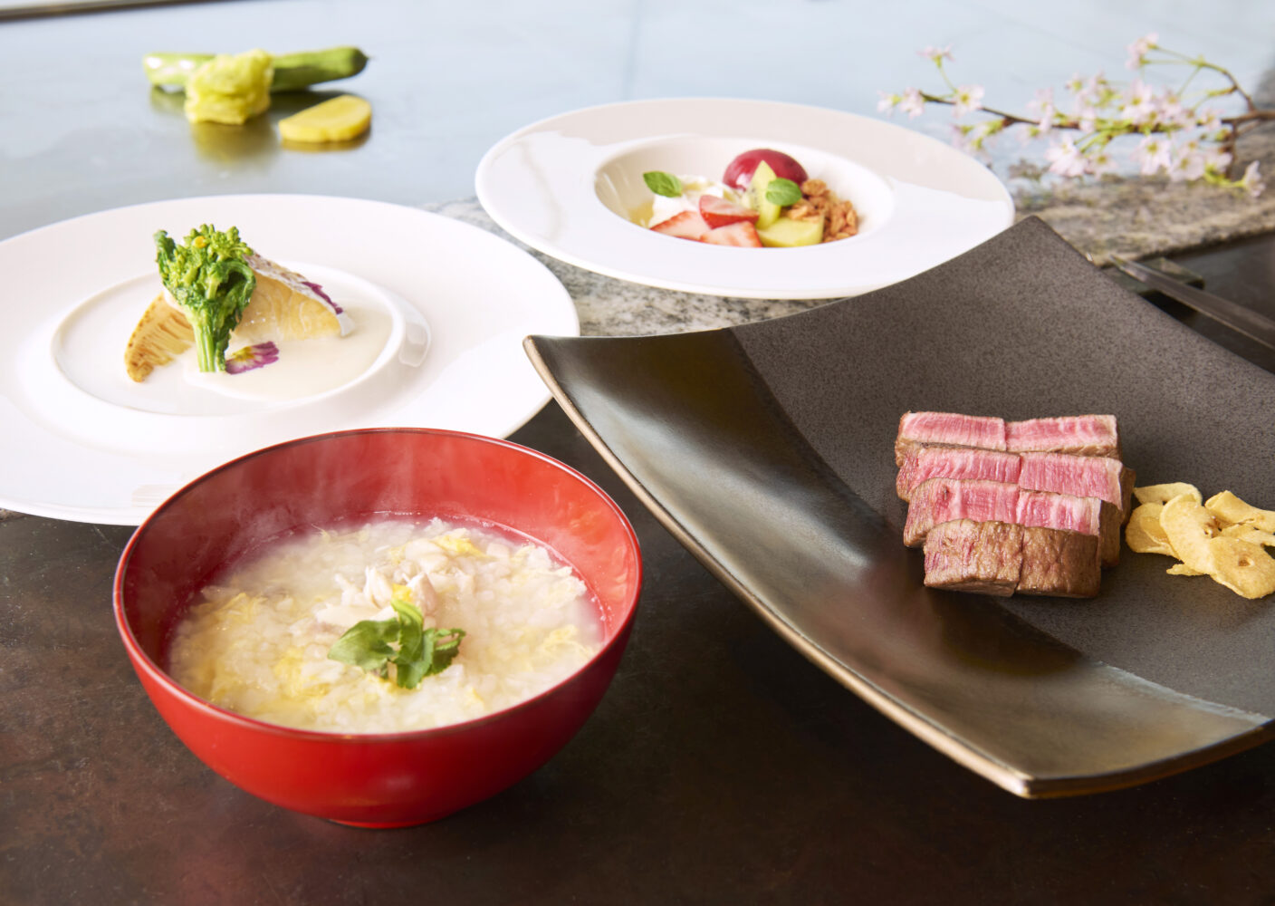 黒毛和牛の鉄板焼と河豚雑炊を主役に据えた、初春限定のランチコース。河豚は地域によって「ふく」とも呼ばれ、福に通じる縁起の良い食材として親しまれてきました。新たな季節の始まりに、皆様へ福が訪れることを願い、滋味深い河豚雑炊としてお届けいたします。目の前で仕上げる鉄板焼の臨場感とともに、穏やかな昼のひとときをご堪能ください。