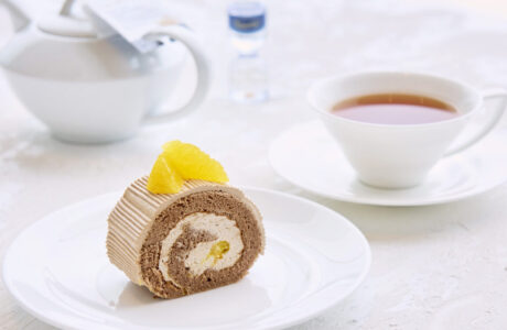 米粉を使用したチョコレートロールケーキ。しっとりと焼き上げたスポンジに、なめらかなチョコレートクリームと自家製マーマレードを閉じ込めました。パティシエの技が光る逸品です。
