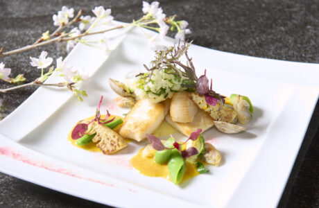 ◆一例のご紹介 <平目のプランチャ 春野菜とコキヤージュ ~旨味豊かなサフラン香る貝のジュと共に~>